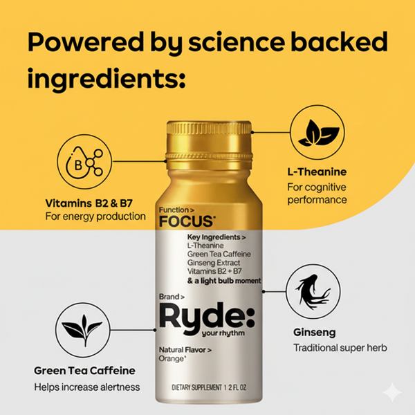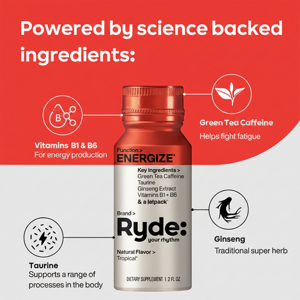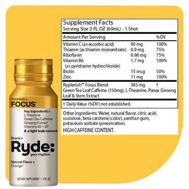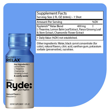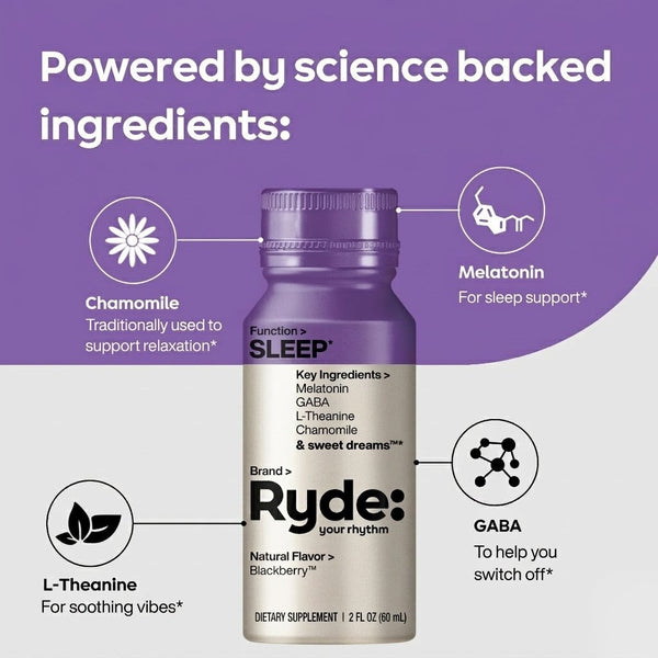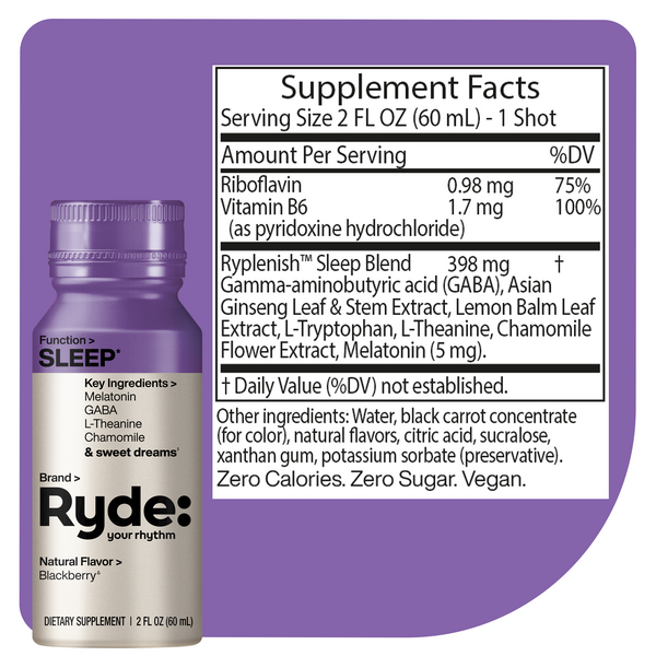 *These statements have not been evaluated by the Food and Drug Administration. This product is not intended to diagnose, treat, cure, or prevent any disease. Ryde: Sleep is for occasional short-term use only. When used, do not consume more than one shot per day.